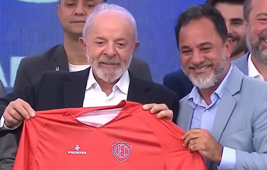Marco Antônio presenteia Lula com camisa do Valério durante visita em Itabira