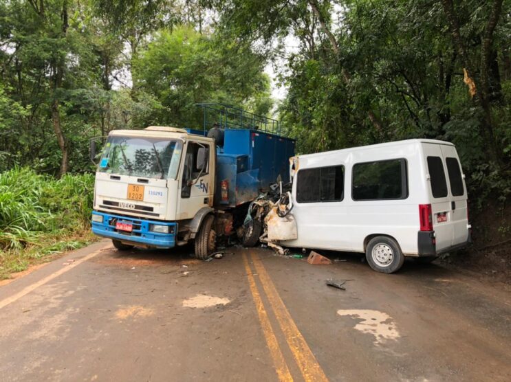No local, o motorista do caminhão tanque, que transportava 1.500 litros de diesel, em uma curva, ao desviar de uma árvore caída na pista, invadiu a contramão e bateu de frente com a van, que seguia no sentido contrário.