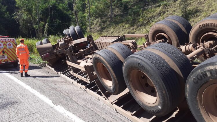 Na manhã desta terça-feira (18), o Corpo de Bombeiros foi acionado para socorrer o motorista de uma carreta carregada com bobinas de arame que tombou às margens da rodovia BR-381, próximo ao trevo de acesso à Barão de Cocais. O acidente aconteceu por volta das 9h.