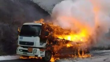 Caminhão carregado com produto perigoso pega fogo e interdita BR-381