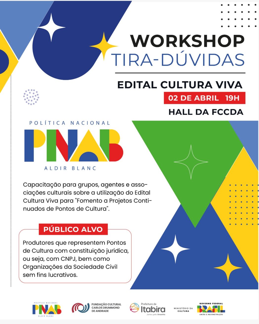 Nesta quarta-feira, dia 2 de abril, a Fundação Cultural Carlos Drummond de Andrade (FCCDA) realiza o workshop “Edital Cultura Viva PNAB”, uma capacitação destinada a grupos, agentes e associações culturais interessados em aprender sobre a utilização do Edital Cultura Viva para o fomento a projetos continuados de Pontos de Cultura.