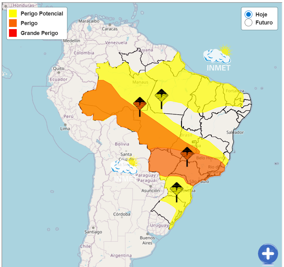 Para esta quarta-feira (11), o instituto emitiu um alerta de grande perigo devido ao acumulado significativo de chuva no norte paulista, sul de Minas Gerais, Triângulo Mineiro e região central de Mato Grosso do Sul. A previsão indica precipitações superiores a 60 milímetros por hora ou que podem ultrapassar 100 milímetros ao longo do dia.