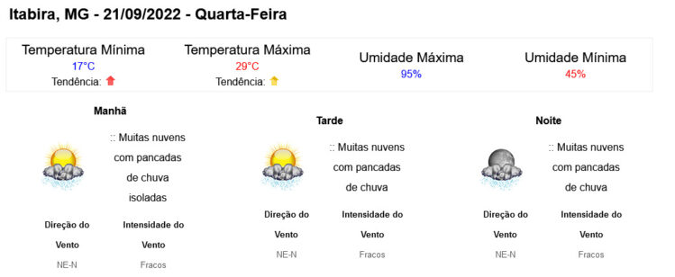 Previsão do tempo para Itabira nesta quarta, 21 de setembro