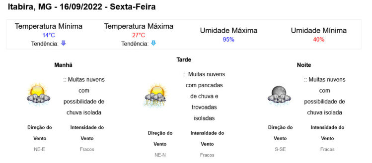 Previsão do tempo para Itabira nesta sexta, 16 de setembro Há possibilidade de chuvas isoladas por Thales Benício 16 de setembro de 2022, 07:44 A previsão do tempo para Itabira nesta sexta-feira (16/09), é de muitas nuvens, com possibilidade de chuvas isoladas e à tarde poderá haver trovoadas. Chuva: 10mm – 67% Sol: 05:47h – 17:47h Deixe um comentário Cancelar respostaO seu endereço de e-mail não será publicado. Campos obrigatórios são marcados com *Comentário * Nome * E-mail * Site Salvar meus dados neste navegador para a próxima vez que eu comentar.