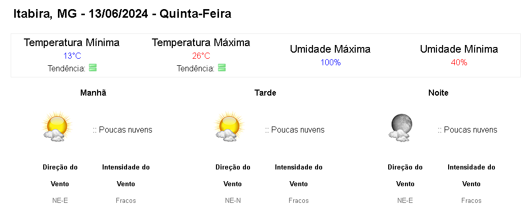 A quinta-feira (13/6) terá predomínio de sol e baixos índices de umidade relativa do ar, à tarde, em quase todo o estado de Minas Gerais. A massa de ar seco segue atuando sobre grande parte do país, mantendo o tempo estável. Não se descarta a possibilidade de formação de geada em pontos isolados da Serra da Mantiqueira.