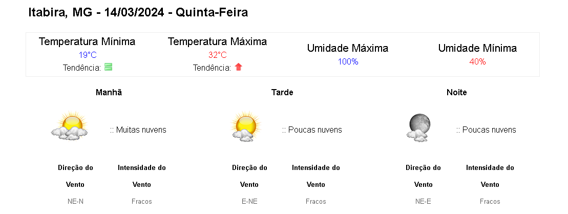 Nesta quinta-feira (14/3), a previsão é de céu parcialmente nublado com pancadas de chuva e trovoadas isoladas no Noroeste, Central Mineira e Triângulo Mineiro/Alto Paranaíba. No Norte e Jequitinhonha, céu parcialmente nublado com possibilidade de chuva isolada. Demais regiões, céu claro a parcialmente nublado.