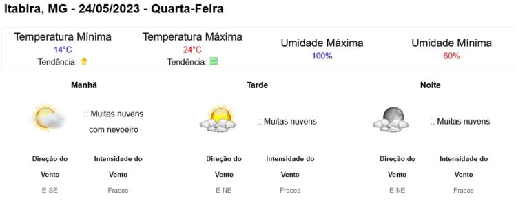 Céu nublado a parcialmente nublado com chuvisco no Rio Doce, Mucuri e Jequitinhonha. Céu nublado a parcialmente nublado com névoa úmida ao amanhecer no Sul/Sudoeste, Campo das Vertentes e Zona da Mata. Nas demais regiões, céu parcialmente nublado.