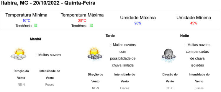 Nesta quinta-feira (20/10), a previsão do tempo é de céu nublado com pancadas de chuva e trovoadas isoladas no Sul/Sudoeste, Campo das Vertentes e Zona da Mata. No Oeste, Triângulo Mineiro/Alto Paranaíba, Central Mineira e Metropolitana, céu parcialmente nublado com pancadas de chuva e trovoadas isoladas.