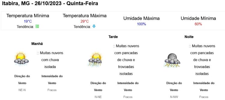 Clique aqui para conferir a previsão completa do Instituto Nacional de Meteorologia (Inmet).
