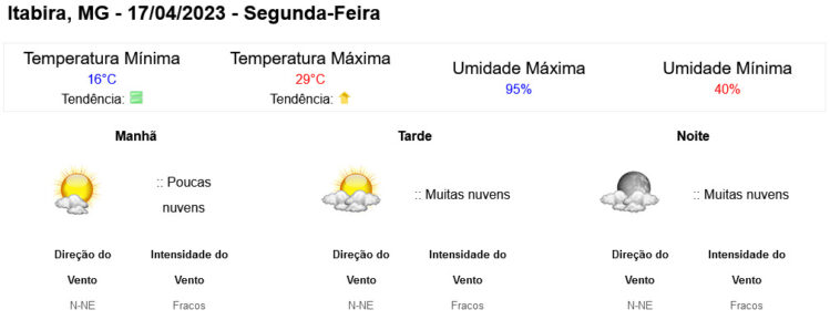 Segunda-feira (17/4) com tempo estável em grande parte do estado de Minas Gerais por causa da presença de uma massa de ar mais seco e relativamente quente. Porém, a partir da tarde, a instabilidade aumenta no Sul e Triângulo Mineiro e são previstas pancadas de chuva que podem vir acompanhadas de descargas elétricas e rajadas de vento ocasionais.