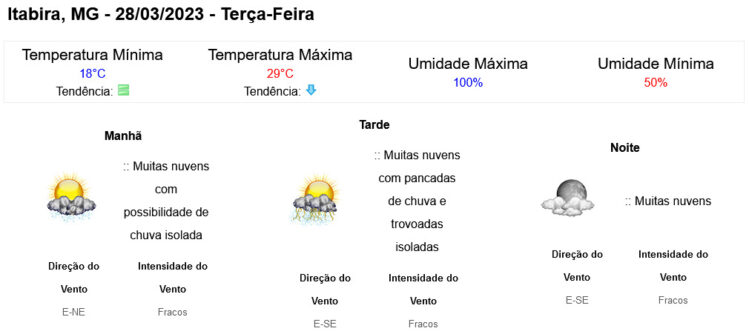 Nesta terça-feira (28/3), há previsão de pancadas de chuva, acompanhadas de raios e rajadas de ventos ocasionais sobretudo nas regiões Sul e Zona da Mata.