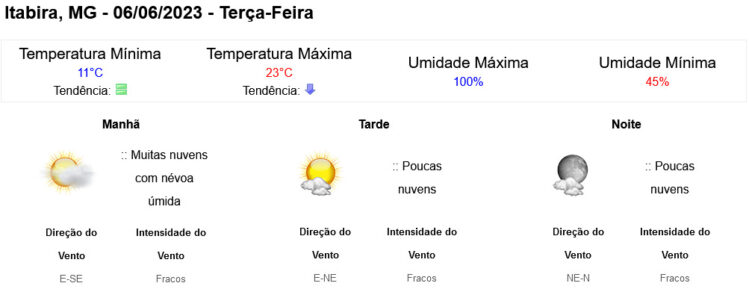 Nesta terça-feira (6/6), o tempo segue estável na maior parte de Minas Gerais e haverá declínio da umidade relativa do ar, exceto na região Leste.