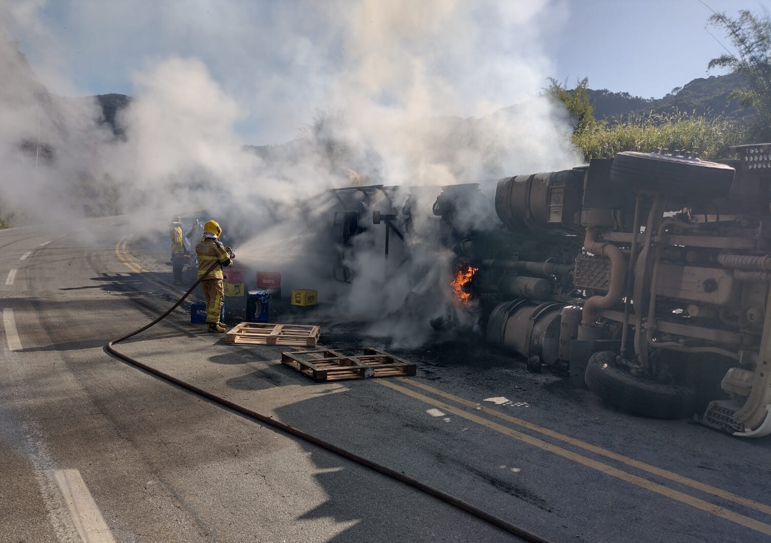 Carreta carregada com cerveja tomba e pega fogo em Capoeirana