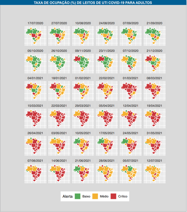 Entre as capitais, Goiânia é a única com mais de 90% dos leitos ocupados (92%), e a situação também é considerada crítica em Brasília (80%), Rio de Janeiro (81%) e São Luís (81%). De acordo com a Fiocruz, 12 capitais estão fora da zona de alerta: Porto Velho (57%), Rio Branco (24%), Belém (48%), Macapá (52%), Natal (53%), João Pessoa (40%), Recife (50%), Maceió (55%), Aracaju (50%), Salvador (52%), Vitória (54%) e Florianópolis (53%). As demais estão na zona de alerta intermediário.